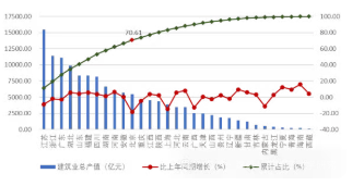 2025 年上半年,江蘇、浙江、廣東建筑業(yè)總產(chǎn)值均超過了1萬億元,分別達(dá)到15455.97億元、11393.61億元和11092.06億元,分別占全國建筑業(yè)總產(chǎn)值的11.30%、8.33%和8.12%。此外,總產(chǎn)值超過5000億元的還有湖北、山東、福建、四川、湖南、河南、安徽、北京共8個地區(qū),上述 11 省市完成的建筑業(yè)總產(chǎn)值占全國建筑業(yè)總產(chǎn)值的70.61%。從各地區(qū)建筑業(yè)總產(chǎn)值增長情況看,21個地區(qū)的建筑業(yè)總產(chǎn)值較上年同期都有不同幅度的增長。其中,海南的增幅最大,達(dá)到了15.79%。寧夏的增幅達(dá)到12.43%。10個地區(qū)的建筑業(yè)總產(chǎn)值較上年同期出現(xiàn)下降,其中北京、上海、廣西、內(nèi)蒙古的降幅均超過10%(圖 1)。